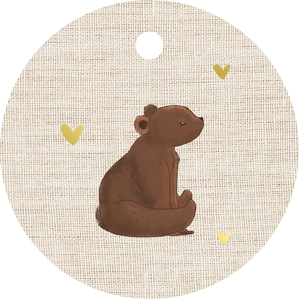 Een stoer rond labeltje voor een jongen met een beertje en klassieke linnenlook achtergrond. Perfect voor doopsuiker versiering of te combineren met een minimalistisch geboortekaartje. Je kan dit ronde labeltje volledig zelf aanpassen met de eenvoudige online editor.