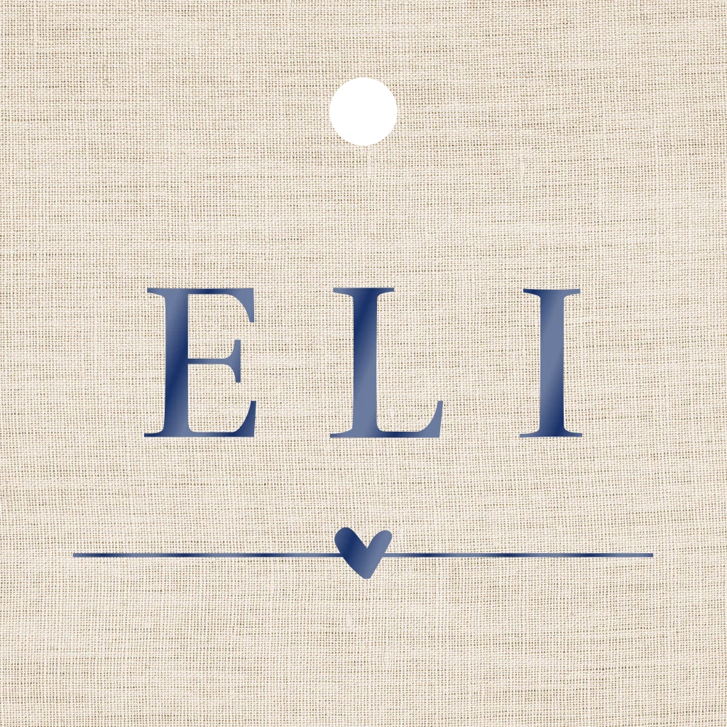 Doopsuiker label voor een jongen passend bij het geboortekaartje met linnen en blauwe folie. Het kaartje is 4 x4 cm en heeft een gaatje. Je kan een touwtje bijbestellen. Met luxe foliedruk.