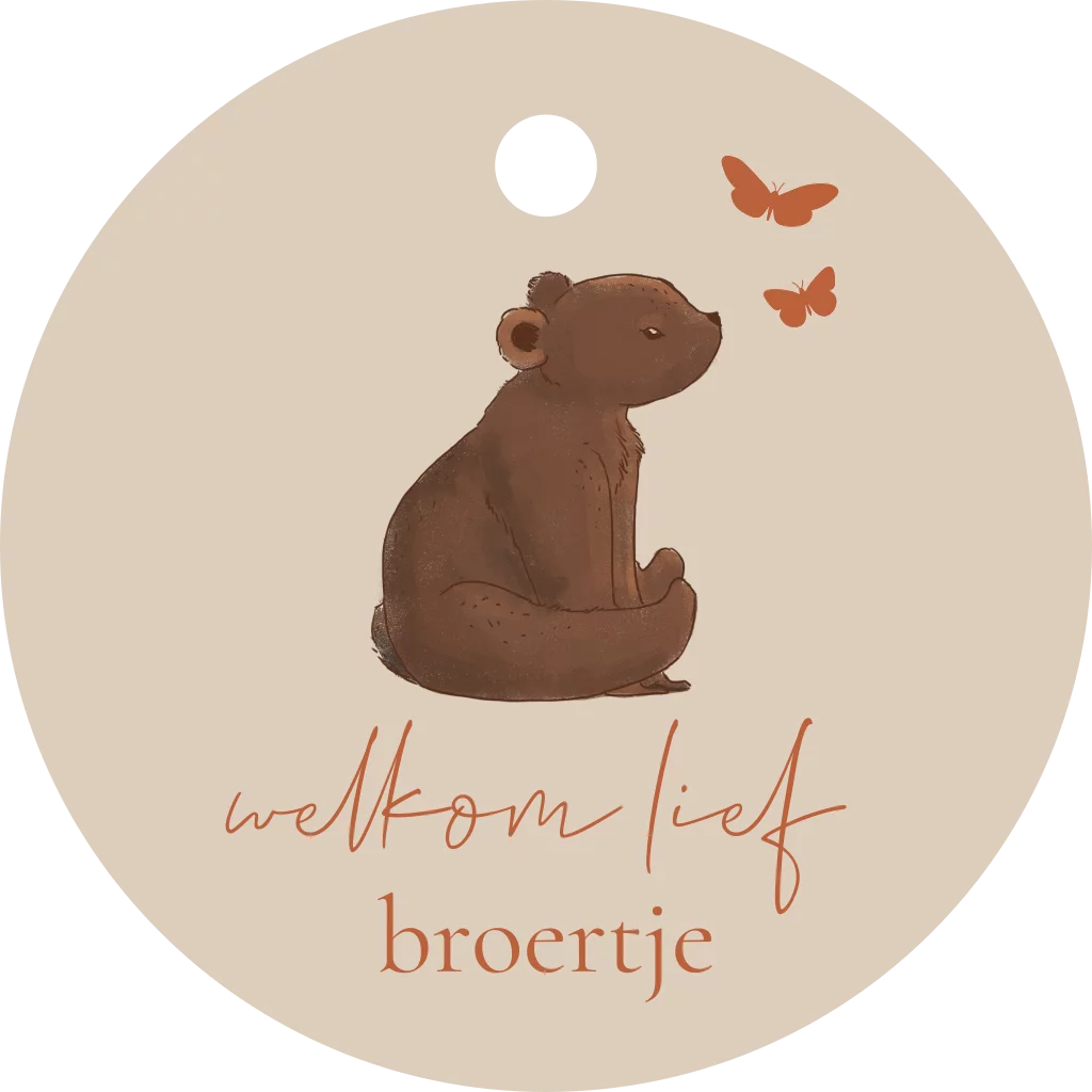 Een origineel rond labeltje met en beertje en vlinders. Je kan zelf koperfolie toevoegen. Perfect voor doopsuiker versiering of te combineren met een minimalistisch geboortekaartje. Je kan dit ronde labeltje volledig zelf aanpassen met de eenvoudige online editor.