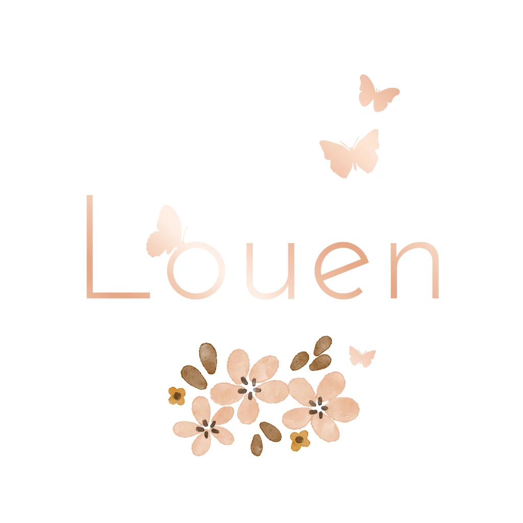 Een origineel lief rond labeltje voor een meisje met bloemen , rosefolie en vlinders. Perfect voor doopsuiker versiering of te combineren met een minimalistisch geboortekaartje. Je kan dit ronde labeltje volledig zelf aanpassen met de eenvoudige online editor.