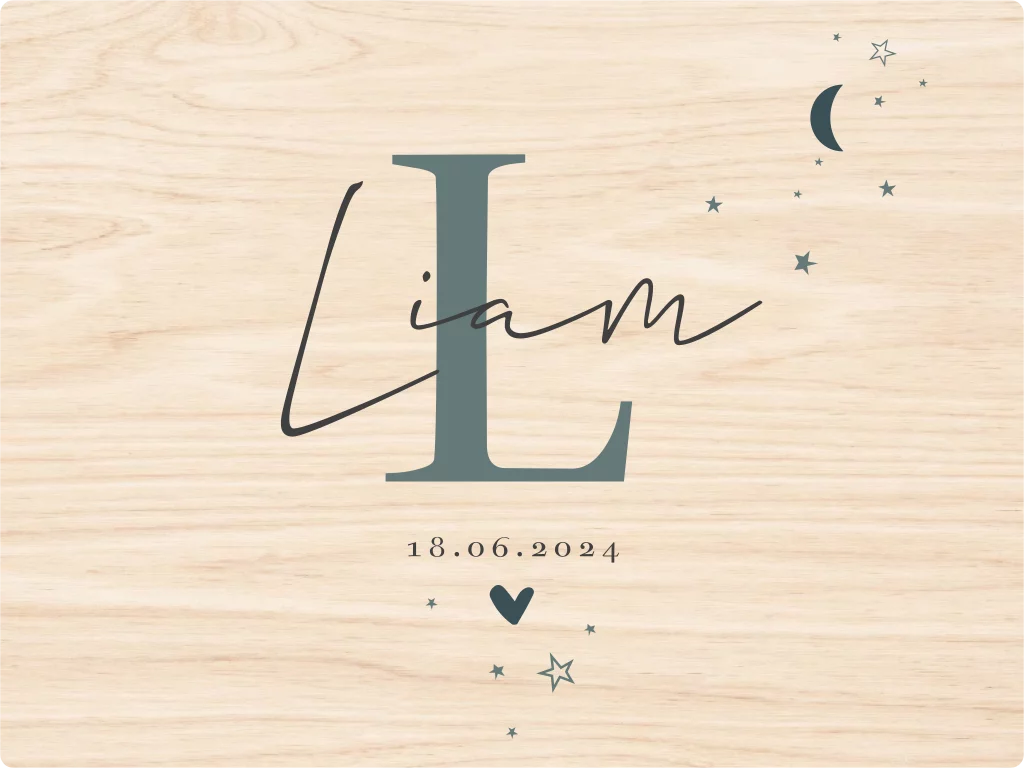 Stoere baby memorybox! De box is heel mooie en minimalistisch met het initiaal en de naam van het kindje , sterretjes en de geboortedatum. Mooi voor een zoon of een dochter. In de memorybox kan je herinneringen bewaren van de zwangerschap of babytijd zoals het eerste babypakje, rammelaar en natuurlijk het geboortekaartje. De box is naar wens te personaliseren in onze online editor. Deze grenen houten box heeft een afmeting van 40x30cm breed en 13cm hoog en heeft een handgreep aan elke kant. Leuk om jezelf of een ander cadeau te geven. Tip | vraag de box als kraamcadeau