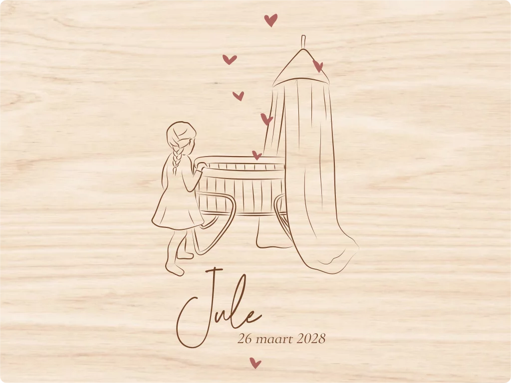 Originele memorybox met een lijntekening van een zusje bij de wieg . In de stijl van het geboortekaartje. In de memorybox kan je herinneringen bewaren van de zwangerschap of babytijd zoals het eerste babypakje, rammelaar en natuurlijk het geboortekaartje. De box is naar wens te personaliseren in onze online editor. Deze grenen houten box heeft een afmeting van 40x30cm breed en 13cm hoog en heeft een handgreep aan elke kant. Leuk om jezelf of een ander cadeau te geven. Tip | vraag de box als kraamcadeau