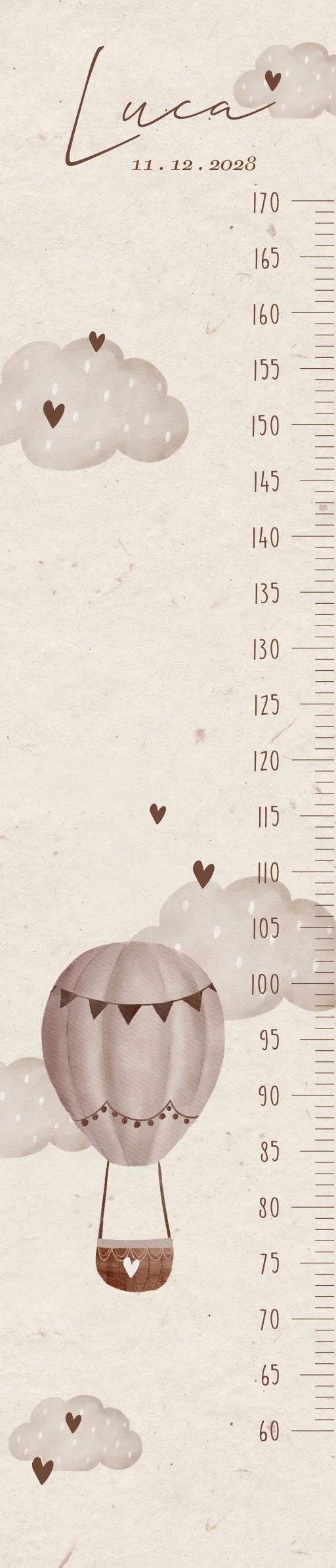 Deze groeimeter is niet alleen praktisch om de lengte van je kind bij te houden, maar ook een echte blikvanger aan de muur. Hang hem naast het bedje, op de deur of aan een lege wand en zie hoe hij jarenlang meegroeit. Zodra je kindje ouder wordt, is het extra leuk om samen te kijken hoe hard hij gegroeid is.De illustratie met luchtballon en wolkjes is speciaal ontworpen voor een jongenskamer en past perfect bij een rustige, sfeervolle inrichting. Dankzij het tijdloze ontwerp blijft deze groeimeter mooi – van baby tot kleuter en verder.Een fijne tip voor aanstaande ouders: vraag deze groeimeter als kraamcadeau in de stijl van jullie geboortekaartje – persoonlijk, tijdloos en jarenlang mooi.