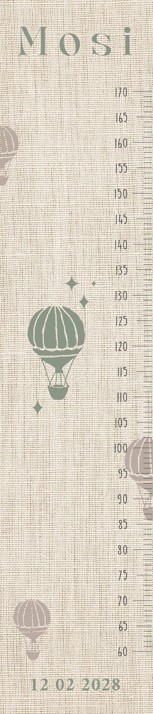 Kindjes groeien vaak sneller dan je verwacht. Met deze groeimeter leg je die groeimomenten vast. De luchtballon in lijntekening geeft het ontwerp een rustige en zachte uitstraling. De linnenlook achtergrond in een neutrale zandkleur vormt een mooie basis, terwijl de groene luchtballon zorgt voor een subtiel kleuraccent. Een groeimeter die past bij de sfeer van een geboortekaartje en mooi staat in de kinderkamer.
