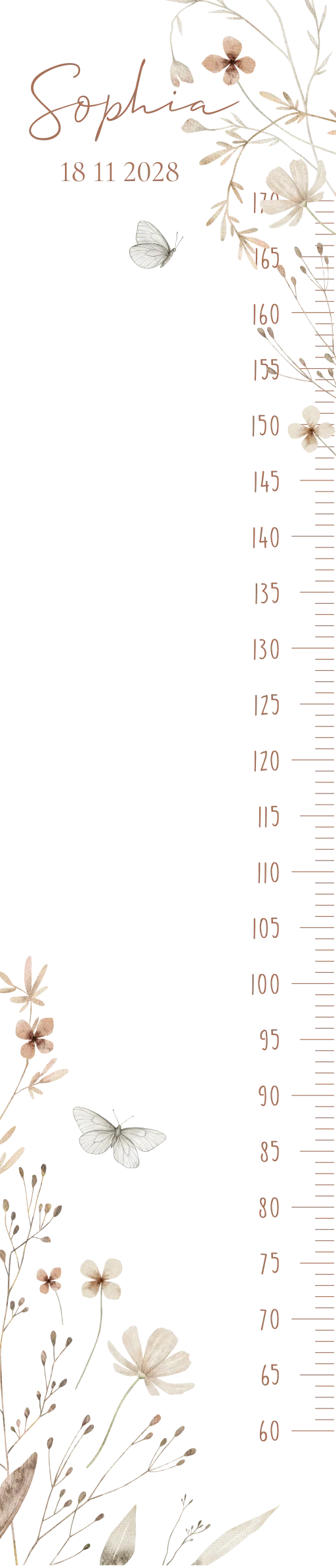 Deze groeimeter heeft een zachte, rustige uitstraling die goed past bij een lichte babykamer. Met deze groeimeter voor een meisje leg je de groei van je kindje vast in een zomerse sfeer. De lieve bloemetjes en kleine vlindertjes zijn subtiel geïllustreerd op een witte, neutrale achtergrond en sluiten mooi aan bij een babykamer met veel wit en naturel tintenMet deze groeimeter meet je eenvoudig hoe je kindje groeit, terwijl het ontwerp mooi past bij de rest van de babykamer. Het lichte kleurenpalet en de verfijnde illustraties maken de groeimeter prettig om naar te kijken, zonder dat het ontwerp te druk wordt.
