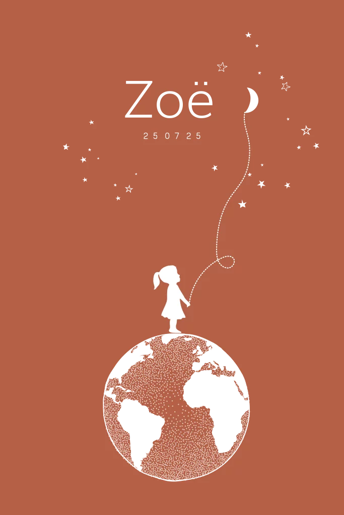 Deze originele poster voor een meisje van het geboortekaartje met warme trendkleur geeft meteen een lieve uitstraling aan de babykamer van jullie dochtertje. De wereldbol en sterretjes in goudfolie. Hip silhouet en maantje als slinger staat heel gaaf op dit grote formaat. Achtergrondkleur eenvoudig aan te passen in de ontwerptool.