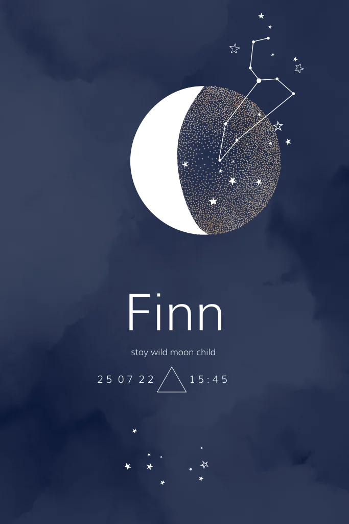 Een geboorteposter sterrenbeeld in de stijl van het geboortekaartje voor jullie zoon met alle belangrijke informatie geboortedatum en tijd. Supermooi als poster in de babykamer! Je kan zelf illustraties toevoegen of verplaatsen. Plaats zelf het juiste sterrenbeeld en laat die door Zo Mooi omzetten naar foliedruk voordat je de poster besteld... Een unieke en persoonlijke herinnering. Leuk om als kraamcadeau te vragen..