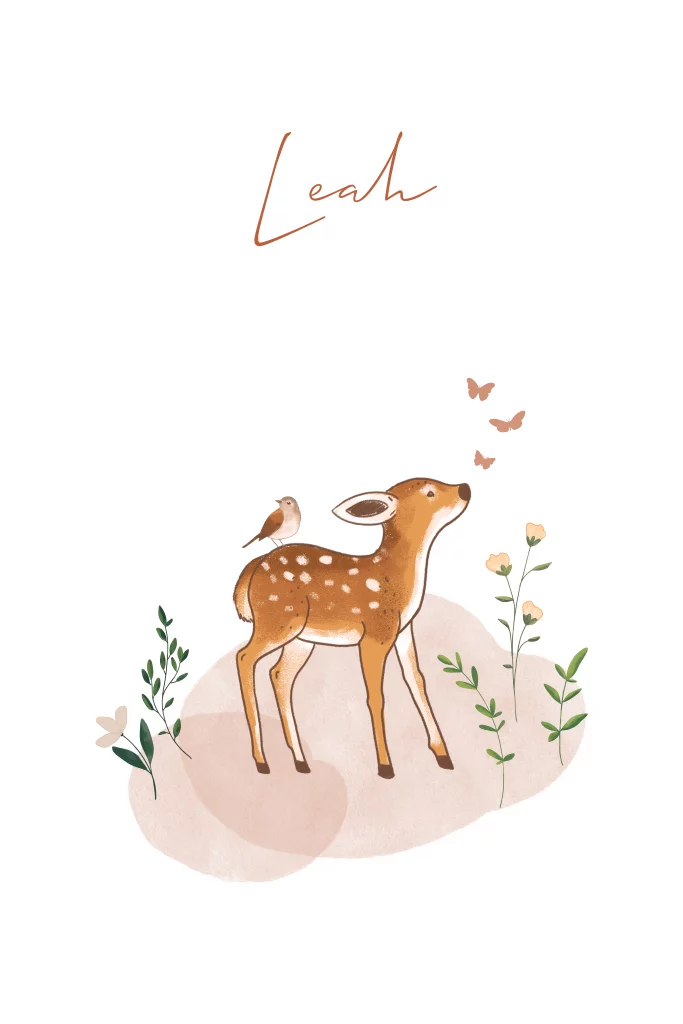 Bijzondere geboorteposter voor een meisje met een illustratie van een hertje en een vogeltje. Mooie bloemen voor de zomer. De babynaam kan ook in folie. Prachtig voor de babykamer van jullie dochter