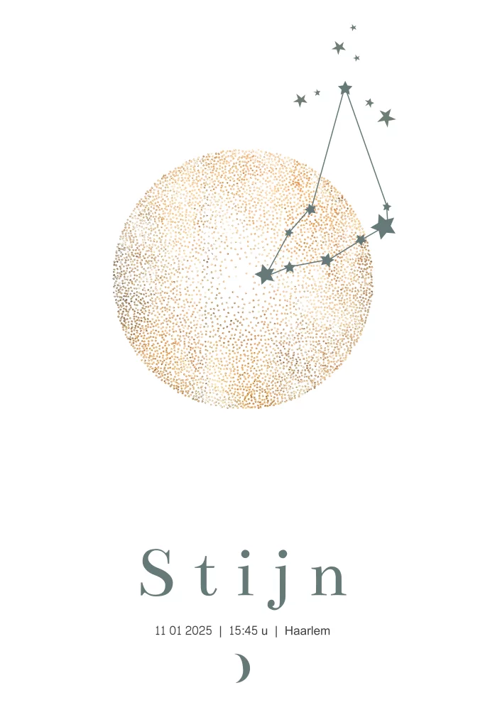 Een geboorteposter sterrenbeeld in de stijl van het geboortekaartje voor jullie zoon of dochter met alle belangrijke informatie geboortedatum, tijd en plaats. Supermooi als poster in de babykamer Je kan zelf illustraties toevoegen of verplaatsen. Plaats zelf het juiste sterrenbeeld vóór je besteld. Een unieke en persoonlijke herinnering. Leuk om als kraamcadeau te vragen.