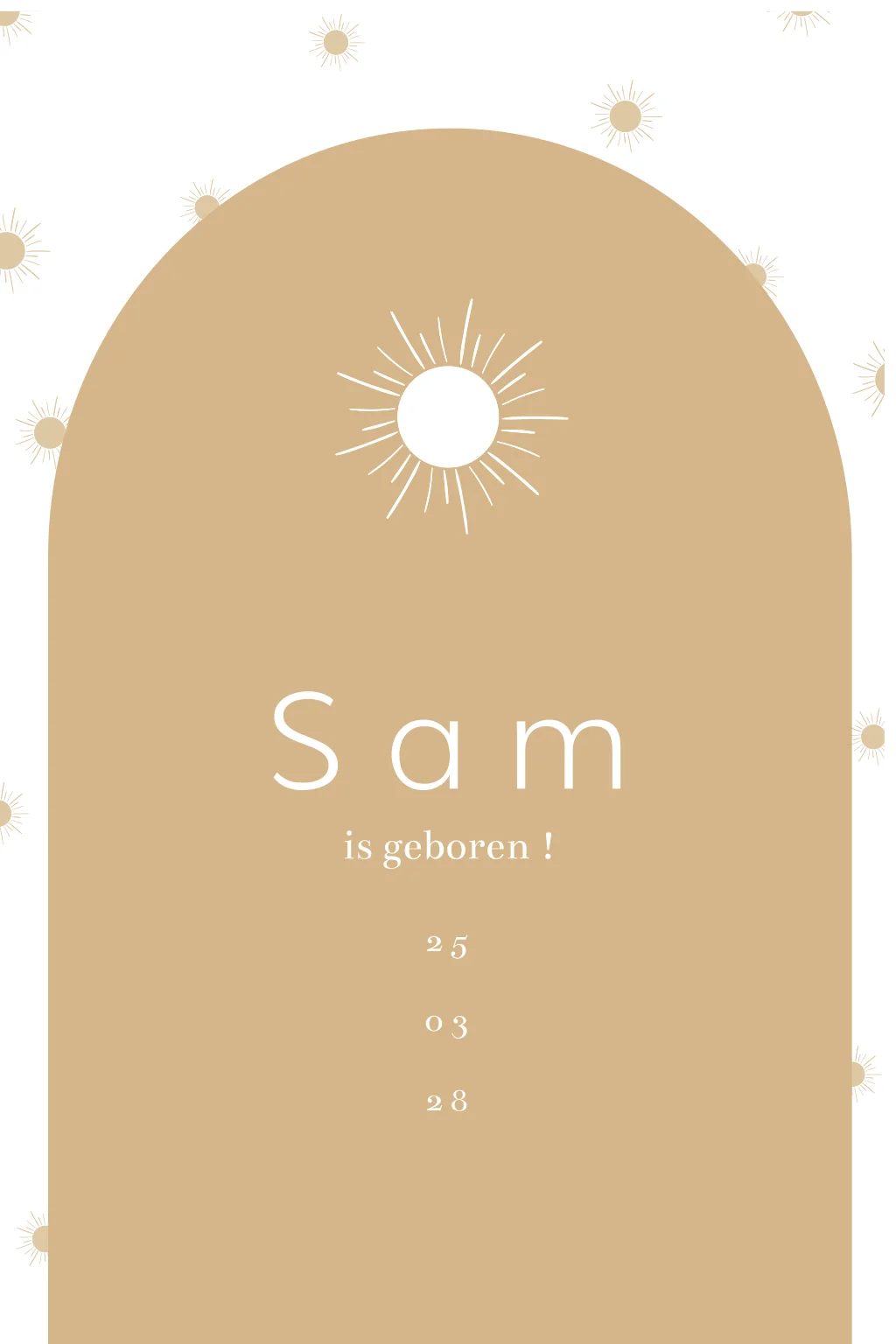 Kondig de geboorte van jullie zoon aan met een origineel raambord met een zon. Het geboortebord kan gemakkelijk bewerkt worden in onze online editor. Je maakt één zijde op in de editor en dit wordt vervolgens op twee zijdes gedrukt. Tip: je kan het bord na gebruik doormidden snijden om vervolgens 1 zijde in de babykamer te hangen.