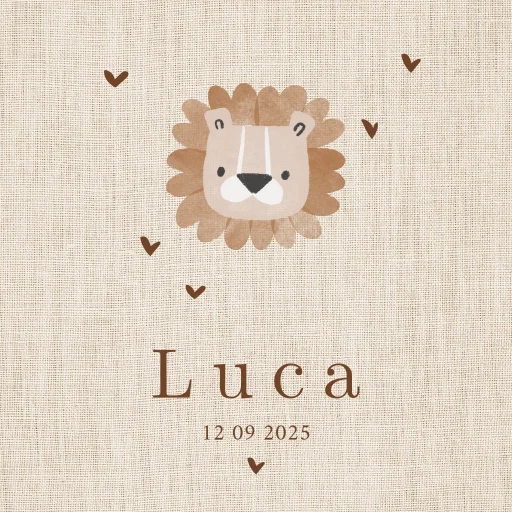 Stoer geboorte tegeltje met een leeuw op linnen look achtergrond en lieve hartjes. Je kan zelf de geboortegegevens personaliseren. Het geboorte tegeltje is helemaal in de stijl van het geboortekaartje.
