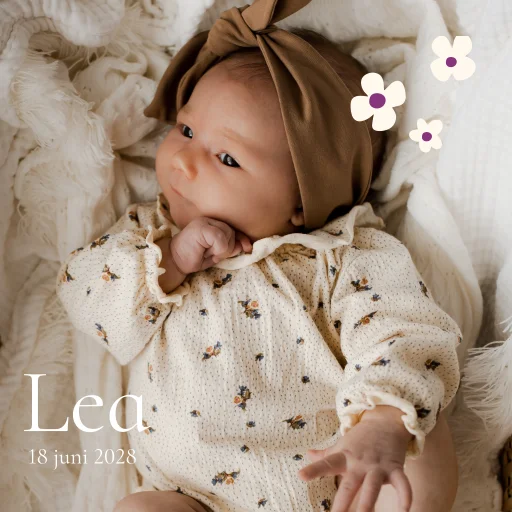 Mooie geboortetegel met de babyfoto van jullie dochter en bloemen in de stijl van het geboortekaartje. Je kan zelf het tegeltje personaliseren met de bloemen die in de beeldbank staan.