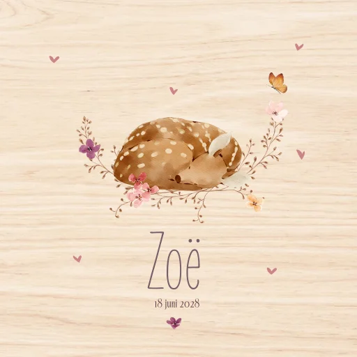 Dit houten geboortetegeltje voor een meisje heeft een lief hertje, subtiele bloemetjes en een vlinder. Door het ontwerp in de stijl van het geboortekaartje op het natuurlijke hout te drukken ontstaat een mooie versiering voor de babykamer.