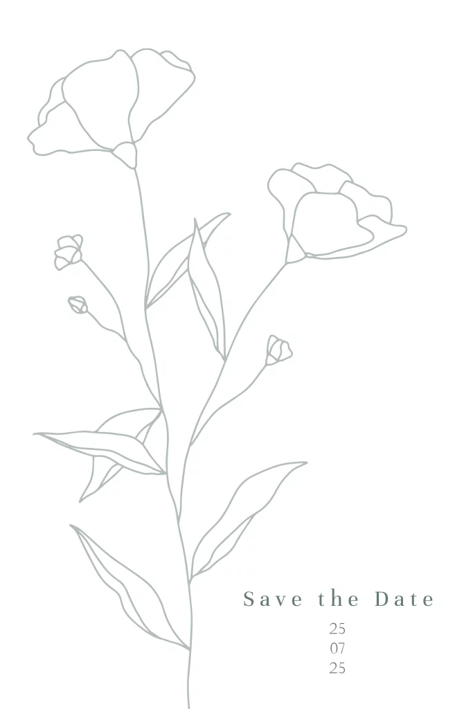 Mooie minimalistische Save the Date kaart met bloem lijntekening Kondig jullie bruiloft aan met de bijpassende Trouwkaart kaart en maak de dag compleet met de huisstijl menukaart, naamkaart en bedankje. Wil je liever een andere kleur? dat is eenvoudig aan te passen in de ontwerptool. Hulp nodig? Neem gerust contact op.