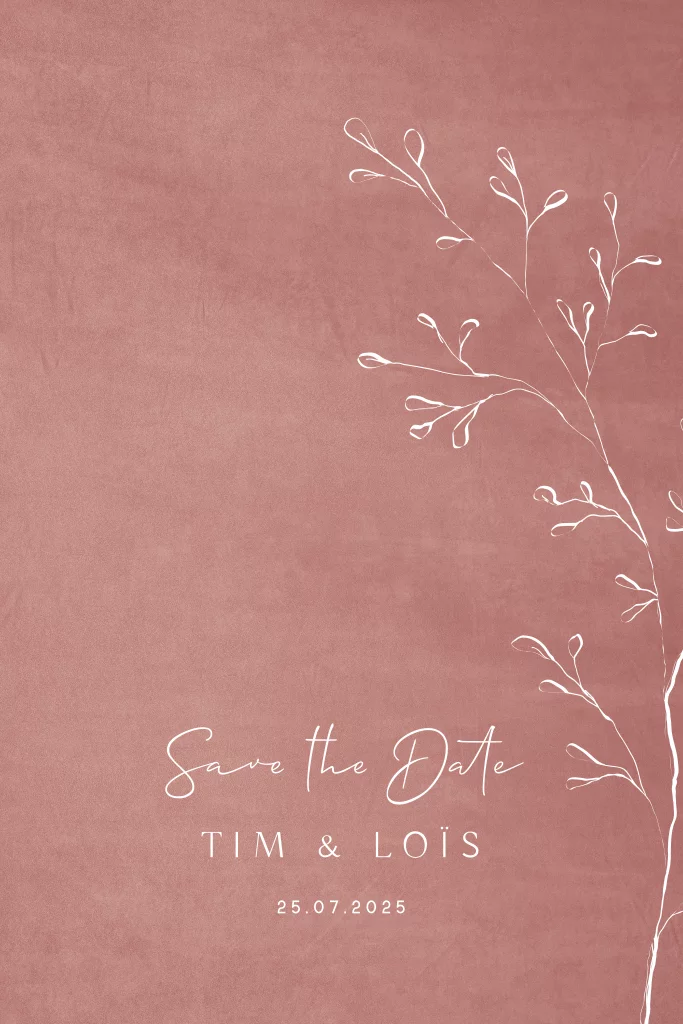 Velvet look Save the Date kaart met subtiele bloem illustratie. Kondig jullie bruiloft aan met de bijpassende trouwkaart kaart en maak de dag compleet met de huisstijl menukaart, naamkaart en bedankje. Wil je liever koperfolie of een andere achtergrondkleur? dat is eenvoudig aan te passen in de ontwerptool. Hulp nodig? Neem gerust contact op.