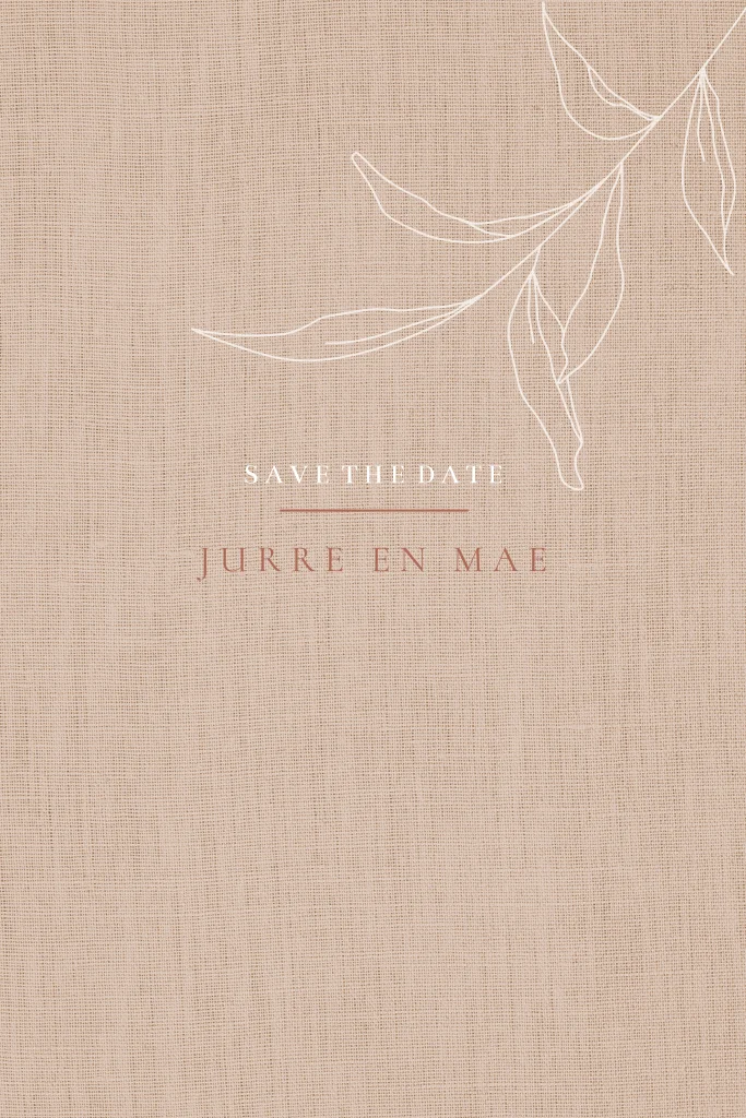 Originele linnen trend Save the Date kaart met mooie illustratie. Kondig jullie bruiloft aan met deze uitnodigingskaart en maak de dag compleet met de huisstijl trouwkaart, menukaart, naamkaart en bedankje. Hulp nodig ? Dat is gratis, dus stuur gerust een berichtje.