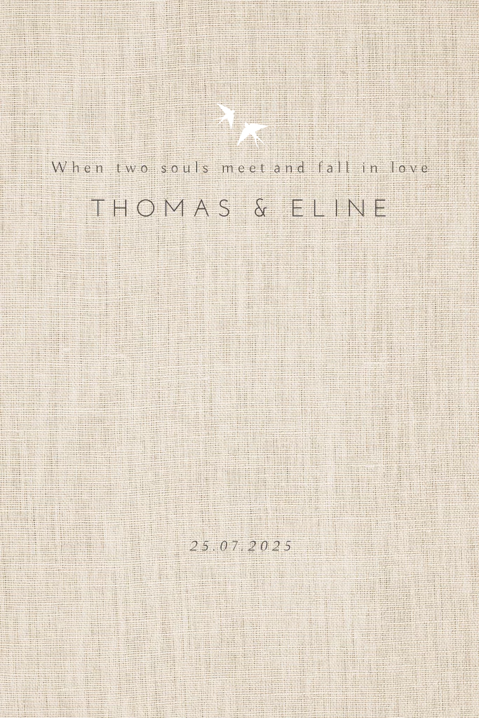 Mooie luxe trouwkaart met goudfolie zwaluw details op een trend linnenlook achtergrond. Kondig jullie bruiloft aan met de bijpassende Safe the Date kaart en maak de dag compleet met de huisstijl menukaart, naamkaart en bedankje. Wil je liever koperfolie of een andere achtergrondkleur? dat is eenvoudig aan te passen in de ontwerptool. Hulp nodig? Neem gerust contact op.