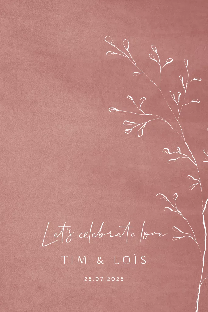 Velvet look trouwkaart kaart met subtiele bloem illustratie. Kondig jullie bruiloft aan met de bijpassende save the date kaart en maak de dag compleet met de huisstijl welkomsbord, menukaart, naamkaart en bedankje. Wil je liever folie of een andere achtergrondkleur? dat is eenvoudig aan te passen in de ontwerptool. Hulp nodig? Neem gerust contact op.