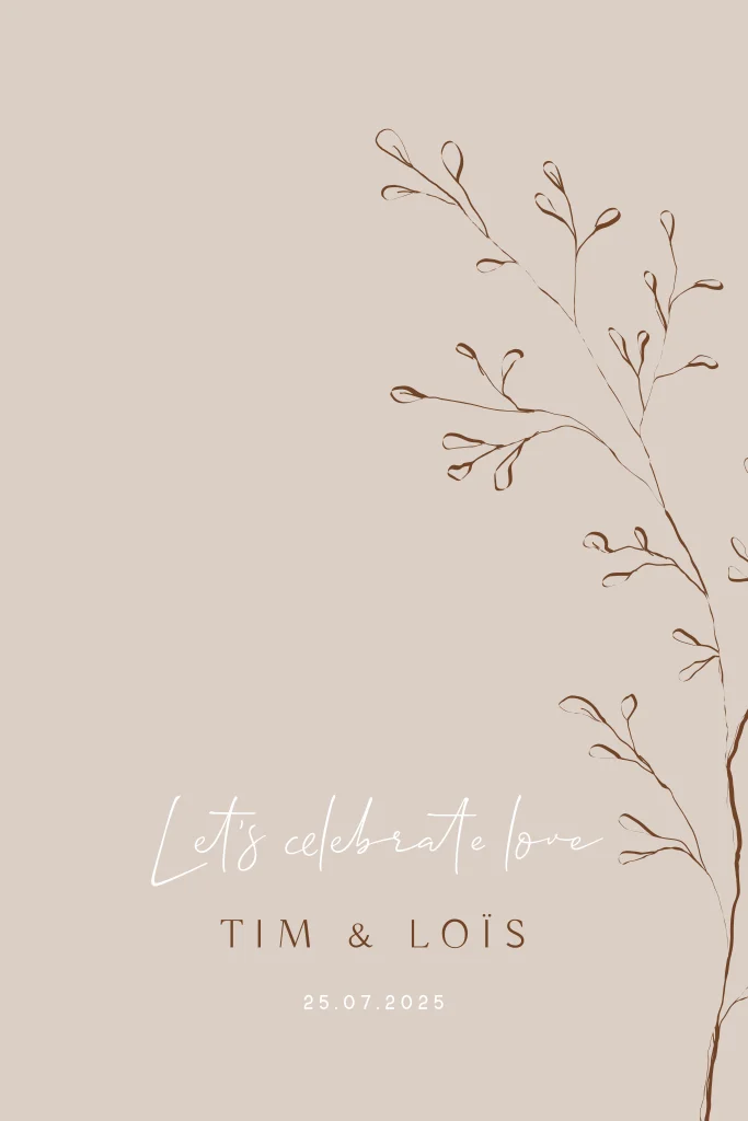 Stijlvolle rustige klassieke trouwkaart uitnodiging met mooie bloem illustratie iin neutrale kleuren. Kondig jullie bruiloft aan met de bijpassende Save the Date kaart en maak de feestelijke trouwdag compleet met de huisstijl menukaart, naamkaart en bedankje. Wil je liever een ander formaat of heb je hulp nodig? Neem gerust contact op.